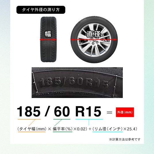 対応タイヤ例:155/60R13、165/70R13、175/70R13、185/60R14、195/60R15、205/60R15 など