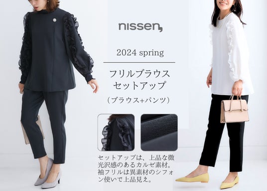 レディスファッションの「nissen,」カタログでは、新しいセレモニースタイルとして、シーンに合わせて着回しができるセットアップ商品を提案しています。きちんと感のあるセレモニーシーンにも、リラックスしたいカジュアルシーンにも活躍する便利なセットアップはニッセンの人気商品です。