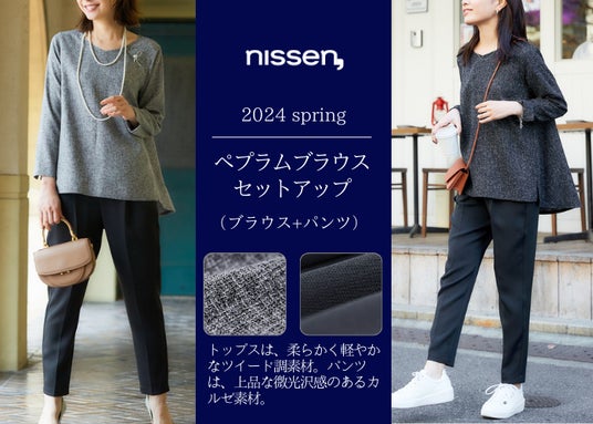 「nissen,」カタログ巻頭商品紹介商品名:ペプラムブラウスセットアップ(ツイード調ペプラムブラウス+タックテーパードパンツ)上下セットはもちろん単品使いもできる優秀アイテム!トップスは柔らかく軽やかなツイード調素材。表情のある表面感が上品で大人の気品ある着こなしに。パンツは、上品な微光沢感のあるカルゼ素材。落ち感のあるソフトな風合いです。