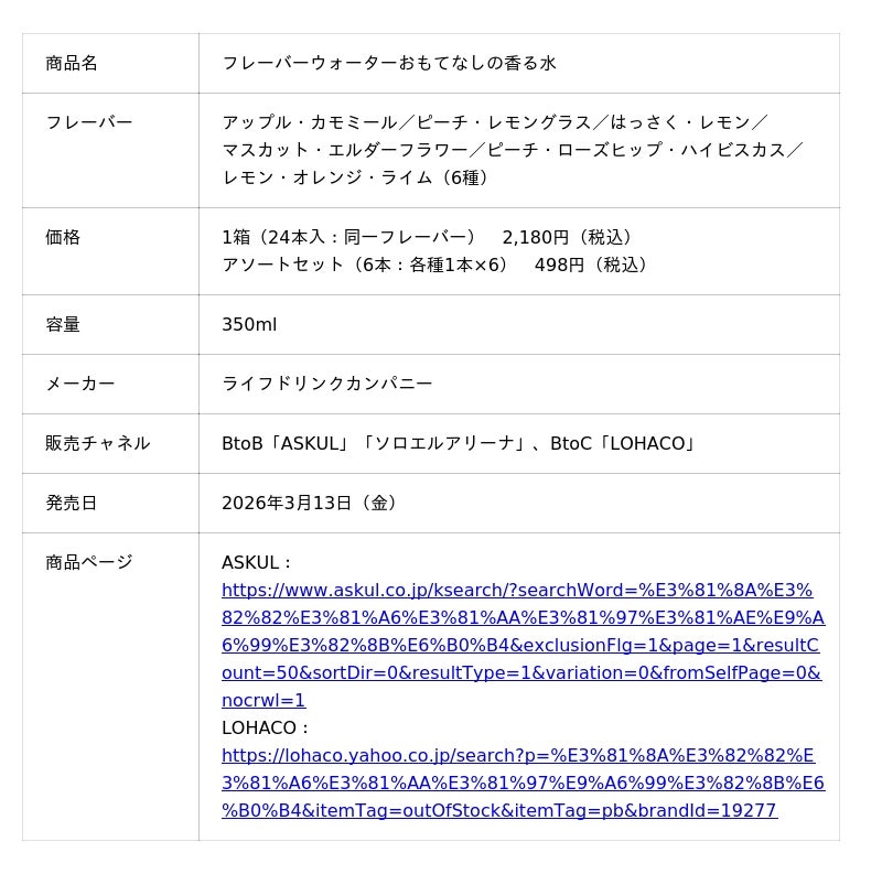 アスクル株式会社(本社:東京都江東区、代表取締役社長:吉岡 晃、以下「アスクル」)は本日3月13日より、事業所向け(BtoB)通販サービス「ASKUL」「ソロエルアリーナ」、および一般消費者向け(BtoC)通販サービス「LOHACO」(ロハコ)において、無糖・無果汁タイプの「フレーバーウォーター おもてなしの香る水」(6種)を発売します。