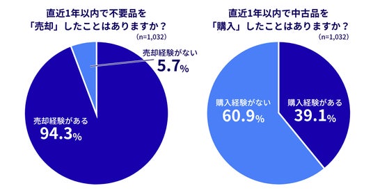 【3】若者は「高回転」、シニアは「高単価」。リユース行動の二極化が顕著直近1年のリユース売却経験・購入経験を聞いたところ、売却経験が94.3%に対して、購入経験は39.1%と開きがあることがわかりました。