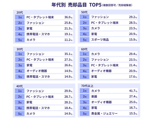 売却品目は、20~30代はファッション中心、60~70代はカメラ・オーディオ中心となり、年代によって売れるカテゴリが明確に異なっています。