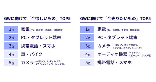 GW時期に欲しいもの、売りたいものは、どちらも1位が「家電」、2位が「パソコン・タブレット」という結果に。また、全体の2人に1人(45.4%)が、この時期に何かしらの売却を検討しており、売りたい理由としては、「ゴミとして処分するのがもったいない・抵抗がある」「旅費や新しい商品への買い替え資金にしたい」「物価高による節約・生活費の足しにしたい」がトップ3となりました。