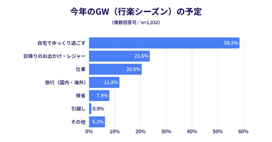 ■調査結果サマリ【1】GWは約6割が「巣ごもり」派、物価高でGWは“資金調達”の好機?【2】70代の4割弱が「10万円超」の売却経験!シニアの換金力が鮮明に【3】若者は「高回転」、シニアは「高単価」。リユース行動の二極化が顕著【1】GWは約6割が「巣ごもり」派、物価高でGWは“資金調達”の好機?今年のGW(ゴールデンウィーク)の予定を聞くと、約6割が「自宅でゆっくり過ごす(58.5%)」と回答しました。「旅行(11.8%)」の約5倍で、在宅時間が長い"巣ごもりGW"だからこそ、普段できない大物の整理や、宅配買取・フリマアプリを使った"在宅リユース"が起きやすい環境が整っています。