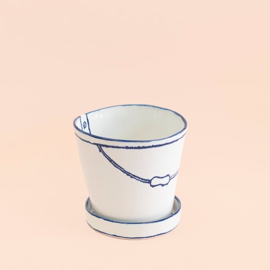 バケツの植木鉢(seto) ¥8,800 / マリアンヌ・ハルバーグ×瀬戸焼の半磁器の植木鉢。マリアンヌ独特の歪みや手書きのラインを再現しました。
