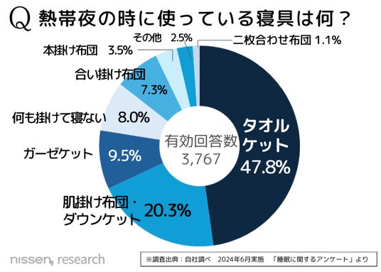 ・熱帯夜の寝具は”タオルケット”がダントツの1位で47.8%と、半数近くの人が使っている。