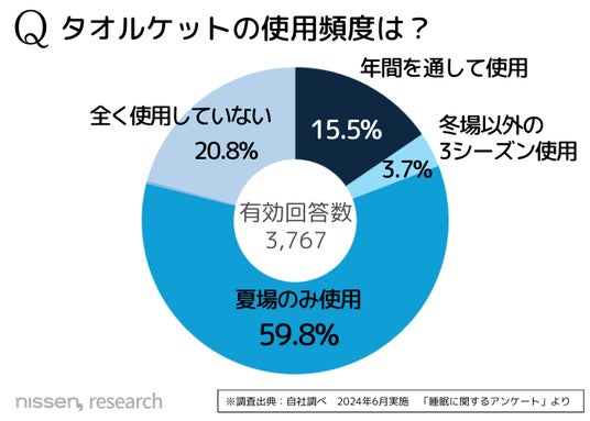 ・タオルケットは”夏場だけ使用”が約60%と最も多いが、実は、15%ほど”年中使用”している人がいる。