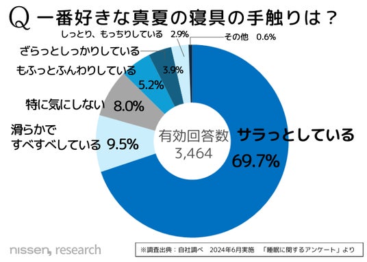 ・真夏の寝具への不満は”暑苦しい”ことが45%で最も多く、好きな手触りは、”サラっとしている”が約70%と圧倒的に人気。