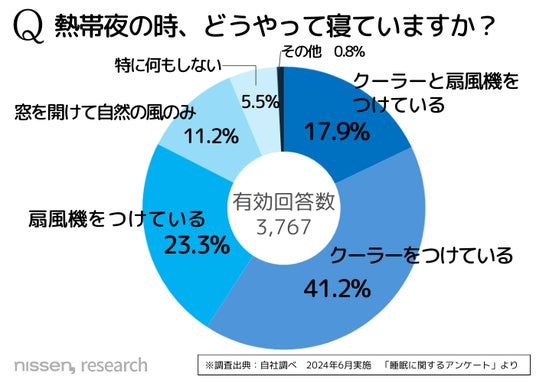 『熱帯夜の過ごし方は、クーラー付けてタオルケットが最も多い。暑苦しくないサラッとした寝具への要望が多い。』・熱帯夜の過ごし方では、”クーラーを付ける”が最も多く41%。”クーラーと扇風機”両方付けている人は18%。