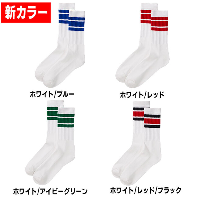 ソリッドカラーだけでなくラインソックスの展開もあり、ハイカットのスニーカーなどか見えるラインがコーデのアクセントに。
