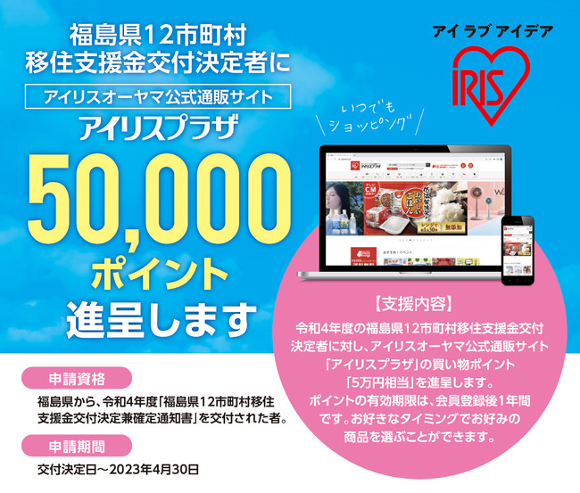 アイリスオーヤマ株式会社 アイリスオーヤマ株式会社(本社:宮城県仙台市、代表取締役社長:大山 晃弘)は、福島県12市町村(※1)への移住者を支援するため、2022年度に対象地域へ移住した福島県12市町村移住支援金交付決定者を対象に50,000ポイント(50,000円相当)を進呈(※2)することを決定し、本日福島県と協定を締結しました。