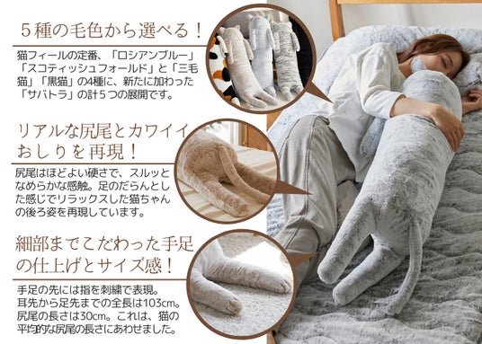 新商品紹介 抱き心地と細部にこだわった「モフモフ抱き枕」猫ならではの癒しポイントである「しっぽ」。「猫フィール」ならではの癒しのポイントとして「しっぽ」をつけた商品はSNSでも高評価をいただきました。単なる綿詰めではなく、芯を感じるようなほどよい硬さにしています。しかも、猫の平均的な尻尾の長さにあわせて30cmに設定。このこだわりにより、スルッと指からしっぽがいなくなる、あの猫の感触を再現できました。