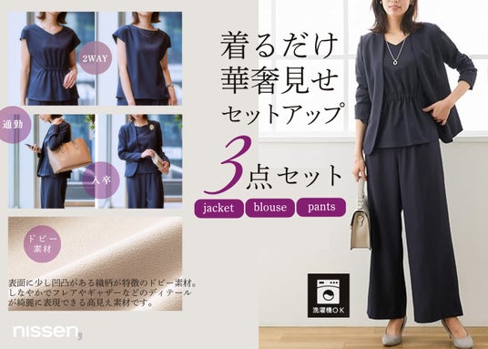 商品名:ドビー素材セットアップセミワイドパンツスーツ3点セット(ノーカラージャケット+2WAYブラウス+パンツ)