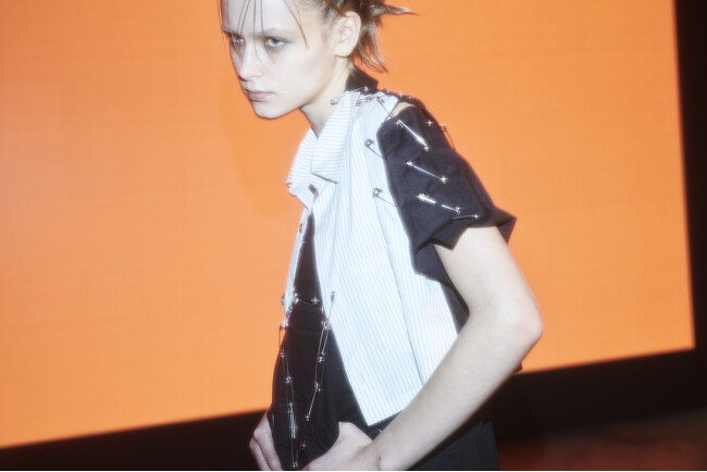 ポケット、ショート丈、フロントにセーフティピンのロングチェーン、留めホールは菊穴刺繍