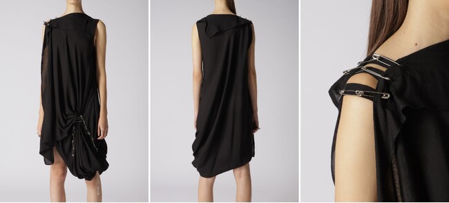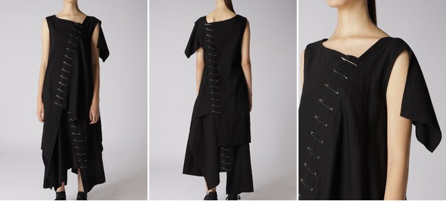 セーフティピン・ドレープワンピース 99,000 yen フロントは細かいドレープにセーフティピンのロングチェーン、バックは肩から流れ落ちる大きな