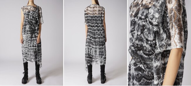 絞り染めレース・ワンピース123,200 yen ラップ仕様、右腕はスリーブレス、左肩はショルダーラップのケープ、左脇にシームポケット