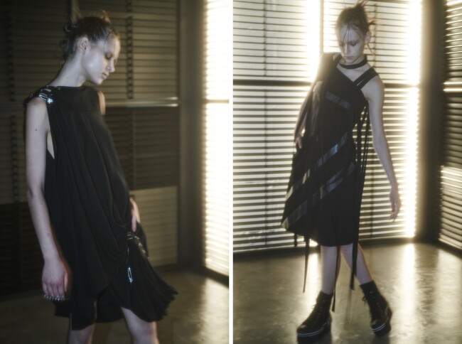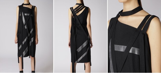ドローコード・テープワンピース 132,000 yen ドローコードとテープが織り成すグラフィック、左脇にスリットポケット、ライトオンスのブラック