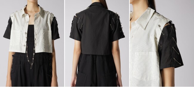 セーフティピン・ハーフスリーブブラウス 70,400 yen メンズライクなストライプとブラックのバイカラー仕立ての半袖ブラウス、Lowポジションのアウト