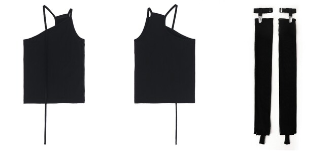 アシンメトリー・キャミソール13,200 yen ガータークリップ付きロンググローブ 28,600 yen (左)大胆なショルダーオフ、ホルターネック、柔らかく整えられた生地面、厳選された超長綿を