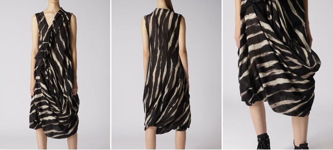 ストライプ・ワンピース 132,000 yen プリミティブなストライプを抜染プリントで表現、アシンメトリーなショールカラー、大きく膨らむ