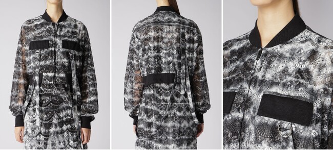 絞り染めレース・ブルゾン178,200 yen 両胸ポケットから背中のヨークにつながるドローコード、ショート丈、ジッパー仕様、ナチュラルな