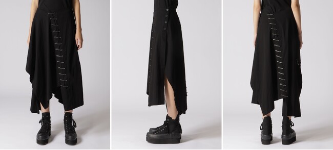 セーフティピン・スカート 81,400 yen アシンメトリーシルエット、ウエストベルトなし、左脇ボタン、セーフティピンの留めホールは菊穴刺繍