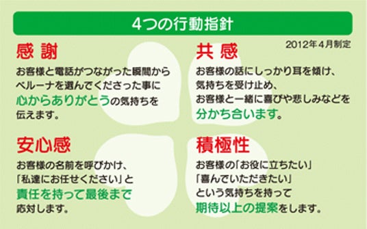 4つの行動指針ベルーナブランドマインドを持ち仕事に取り組み、「感謝」「共感」「安心感」「積極性」の4つの行動で、幸せを運ぶ四葉のクローバーをお客様にたくさんお届けします。コールセンターではポスター掲示とクレドカードを配布し、朝礼での読み合わせや研修にも活用しています。