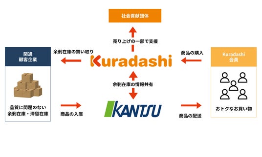 本提携は、関通から余剰在庫や滞留在庫でお困りの荷主企業さまをクラダシにご紹介いただき、その在庫商品をクラダシが買い取ってソーシャルグッドマーケット「Kuradashi」を通じて販売することで、廃棄される可能性のある商品を再流通させる取り組みです。本提携を通じてKuradashiで販売する商品は、関通から直接配送するため、CO2の削減にもつながります。