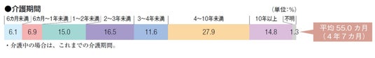 国内では年間10万人が介護を理由に離職し※1、介護離職者数が増加傾向にあることが大きな社会課題となっております。さらに2025年からは「団塊の世代」が75歳以上となることで、さらに深刻化することが予測されており、介護者の働きやすい環境整備が急がれる背景があります。加えて、介護期間が中長期にわたる実態も明らかになっており、介護期間の平均は4年7カ月に及びます。内訳を見ると、「4~10年未満」が27.9%、「10年以上」が14.8%となっており、合わせると4割以上が4年以上にわたり介護を行っている実態が示されています。