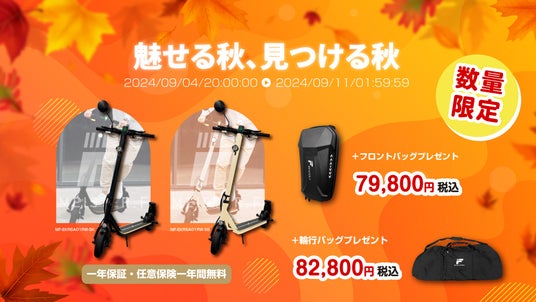 秋の風を感じる季節に、新しいモビリティライフを始めませんか?楽天「Show !t」では、9月4日(水)からのスーパーセールで特定小型電動キックボードを数量限定でご提供!今なら、フロントバッグが無料、さらに輪行バッグも格安で手に入る特典付きです。しかも、安心の任意保険1年間無料キャンペーンも継続中。秋の爽やかな風を感じながら、快適な移動を楽しんでみてはいかがでしょうか。このチャンスをお見逃しなく!