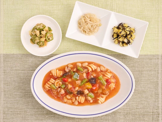 副菜は、オクラのとろみでするっと食べられるオクラとポテトのさっぱりサラダ、バターソースでマイルドに仕上げたえのきソテー、自然な甘みのあるさつまいもと、ミネラル豊富なひじきを組み合わせたさつまいもとひじきのサラダです。