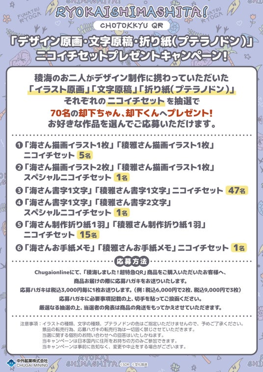 さらに、関連グッズを税込3,000円ご購入毎に、抽選で本人直筆イラスト原画などが当たるキャンペーンにご参加いただけます!2025年5月5日(月)深夜から中外鉱業コンテンツ部ECサイト「Chugaionline」にて受注予約開始となります。