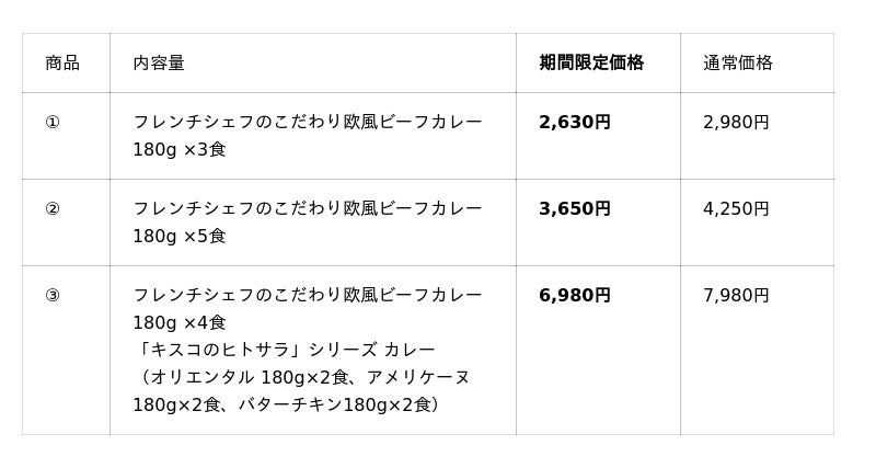 ソーシャルグッドマーケット「Kuradashi」を運営する株式会社クラダシ(本社:東京都品川区、代表取締役社長:河村晃平、以下「クラダシ」)は、キスコフーズ株式会社(本社:東京都豊島区、代表取締役社長:久世真也、以下「キスコフーズ」)と共同で、新商品「フレンチシェフのこだわり欧風ビーフカレー」を開発しました。本商品は、Kuradashiのコアユーザーである「Kuradashiアンバサダー」の声を取り入れ、家庭でも“特別な一皿”を楽しめる冷凍カレーとして誕生しました。このたび、本商品の発売を記念し、11月28日よりKuradashiにて「フレンチシェフのこだわり欧風ビーフカレー 販売記念キャンペーン」を期間限定で開催いたします。・キャンペーン特設サイト:https://kuradashi.jp/pages/kisco-beefcurry-cp■「フレンチシェフのこだわり欧風ビーフカレー販売記念キャンペーン」についてキスコフーズとKuradashiアンバサダーで開発した本商品をお得な価格でご購入いただけるキャンペーンを、11月28日(金)~12月28日(日)の期間限定で実施いたします。