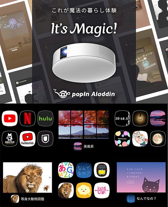 未来の壁を実現、楽しめるアプリが多数搭載いつでも手軽に映画やドラマが楽しめるほか、部屋の雰囲気を変えるインテリアコンテンツ、 親子のコミュニケーションに役立つコンテンツ、暮らしを快適にするコンテンツなど、 popIn Aladdinならではのコンテンツと生活空間体験がどんどん進化していきます。