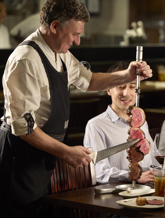 シュラスコとはシュラスコとは、ブラジリアンバーベキューのことです。塊のまま串に刺し岩塩のみで焼き上げたジューシーなお肉を、「パサドール」と呼ばれる肉専門スタッフがそのままの状態でテーブルまでお持ちし、お客様の目の前でお好きな部分をお好きなだけ切り分けてご提供するスタイルのバーベキューです。岩塩のみのシンプルな味付けで、油を一切使わずに焼き上げる為、肉の余分な脂も落ちてとてもヘルシーです。