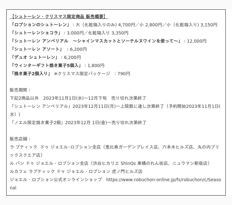株式会社フォーシーズ(東京都港区南青山 代表取締役社長:淺野幸子)が運営する「ラ ブティック ドゥ ジョエル・ロブション」全店、「ル パン ドゥ ジョエル・ロブション」全店、「ルカフェ ラブティック ドゥ ジョエル・ロブション 虎ノ門ヒルズ店」では、2023年11月1日(水)より長年クリスマスシーズンでお客様にお楽しみいただいている人気の『ロブションのシュトーレン』をはじめとしたシュトーレン3種類と、クリスマス限定のアソートメントを期間限定で販売いたします。