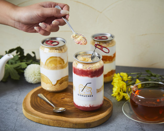 このたび、当社のECサイト限定で『GOKUCHEE』を凝縮した飲むチーズケーキ缶と生チーズケーキ缶の販売を開始します。チーズケーキ缶は季節のフルーツを使用し食感にもこだわっており、ドリンクタイプの『GOKUCHEE』とは一味違う贅沢な一品です。