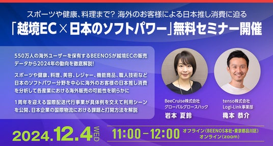 BEENOS株式会社(東証プライム 3328、本社:東京都品川区、代表取締役:直井 聖太、以下BEENOS)は12月4日(水)11時より「日本のソフトパワーと越境ECの購入意向」無料セミナーを開催します。