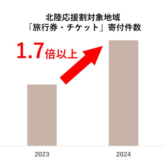 TOPIC2 「北陸応援割」対象地域の「旅行券・チケット」への寄付件数が前年比1.7倍以上、PayPay商品券への寄付件数は5.2倍以上に北陸応援割対象地域(新潟県・富山県・石川県・福井県)で利用できる「旅行券・チケット」カテゴリのお礼品への3月の寄付件数も、前年比1.7倍以上に増加しています。また、同地域で使えるPayPay商品券への寄付件数は、前年比5.2倍以上に伸長しており、北陸応援割を活用して「被災地に行って支援する」際にふるさと納税のお礼品が活用されていると推察されます。