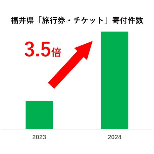 TOPIC1 福井県内で使えるPayPay商品券への寄付が前年比14.7倍に増加、北陸新幹線延伸の影響で体験型お礼品への関心も上昇「さとふる」に掲載している、福井県内で利用できる「旅行券・チケット」カテゴリのお礼品への3月の寄付件数は、前年比で3.5倍に増加しました。その中でも、PayPay商品券への寄付件数は、前年比で14.7倍に増加しています。3月16日に北陸新幹線が福井県の敦賀まで延伸開業したことに伴い、福井県内で利用できる体験型お礼品への関心が高まっていることがうかがえます。
