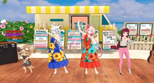 ブース内のステージではバーチャルマーケット公式キャラクターのVketちゃん1号&Vketちゃん2号と一緒にフラダンスを踊ったり、ウクレレを演奏したりすることができるほか、さらにVket来場特典として、ステージでVketちゃん1号&Vketちゃん2号が着用しているムームー、フラワーレイ、ブレスレット、髪飾りの3Dモデルなどを無料で配布します。