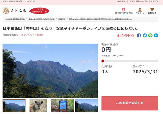 さとふるクラウドファンディング」にて、「日本百名山『両神山』を安心・安全ネイチャーポジティブを進める山にしたい。」の寄付受け付けを2024年4月1日より開始します。
