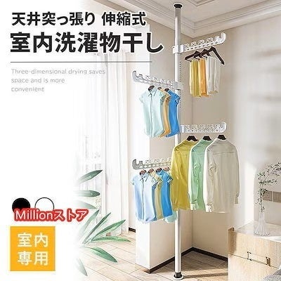 天井突っ張り 室内物干し(ショップ名:スゴイストア)1.1~3.1mまで高さ調整できる伸縮ポールで、縦の空間を有効活用。90°に曲がる4本の回転式アームで、省スペースと使いやすさを両立。