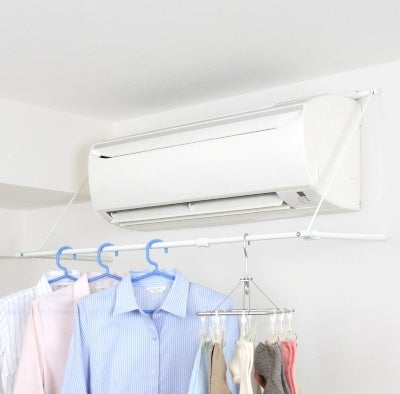 エアコンハンガー(ショップ名:リビングート)エアコンと壁のすき間に引っ掛けて、保持板を差し込むだけ。エアコンの風を利用して効率よく乾燥でき、使用後は折り畳んでスッキリ収納。