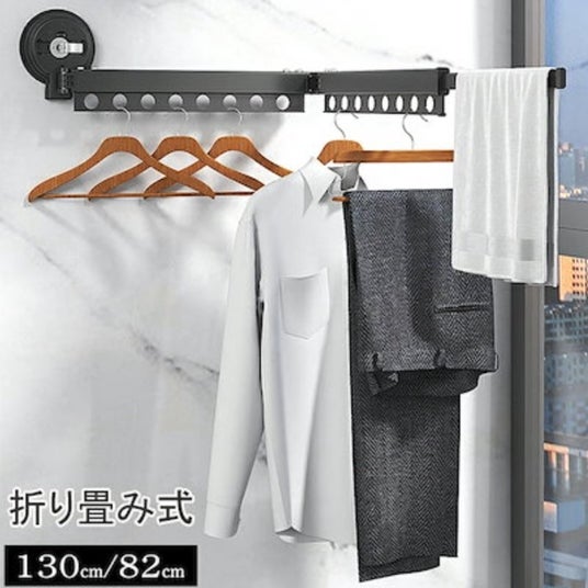 壁付け 洗濯物干し(ショップ名:SOOL)吸盤で壁に取り付けられるウォールハンガー。折り畳み式且つ伸縮可能なので、洗濯物の量に合わせて長さ調節できる!