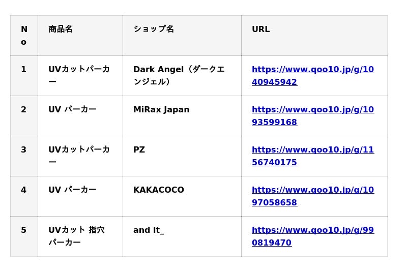UVカット機能&冷感素材が人気! 今回のQoo10の調査でも、羽織るだけで紫外線対策ができるUVカット機能付きで、冷感(涼感)素材を使用した薄手のパーカーが上位に多くランクインする結果となりました。また、手の甲や首から鼻までガードできる設計など、帽子や日傘ではカバーしきれない部分を守れるアイテムも人気です。