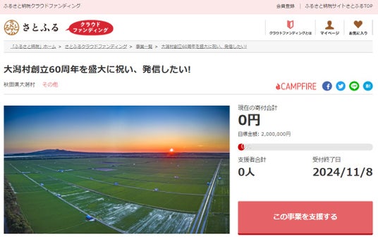 さとふるクラウドファンディング」にて、「大潟村創立60周年を盛大に祝い、発信したい!」の寄付受け付けを2024年7月1日より開始します。