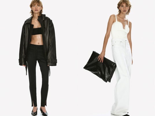 H&M Studio Mini Pre-fall Capsule (ミニ・プレフォール・カプセル): 左:ベルテッドレザージャケット¥34,999 テーラードレギンス¥7,999 キトンヒール レザースリングバックパンプス¥17,999 右: サテンディテールディーププランジトップス¥7,999 ワイドレッグデニム¥9,999 パッデッドレザークロスボディバッグ¥24,999 キトンヒール レザースリングバックパンプス¥17,999