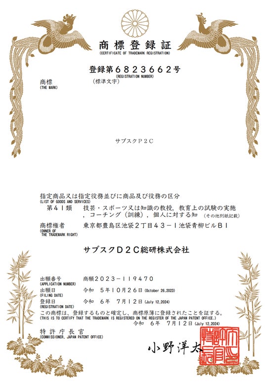株式会社RAVIPAD2C立ち上げ支援を行うサブスクD2C総研株式会社(本社:東京都豊島区池袋、代表取締役社長:新井亨)は、2024年7月12日(金)「サブスクP2C」の商標が特許庁に登録されました。