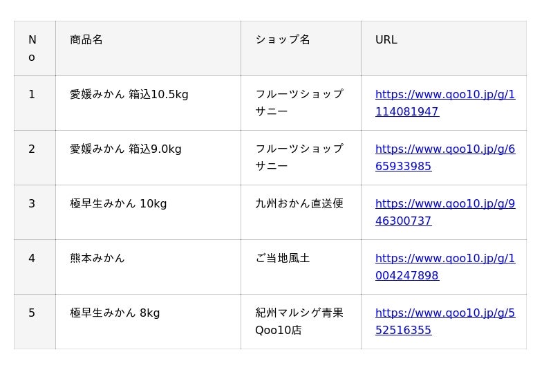 https://www.qoo10.jp/)サイト上、「柑橘類」カテゴリーの販売個数に基づいたランキングです。